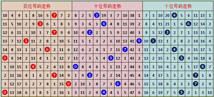 跨度:近10期平均跨度4.8,上期跨度5,与前一期比较上升,近10期最大跨度为8,最小跨度为2;本期预测跨度较上期上升,关注跨度9。