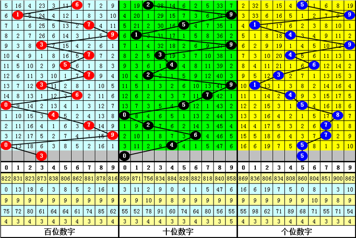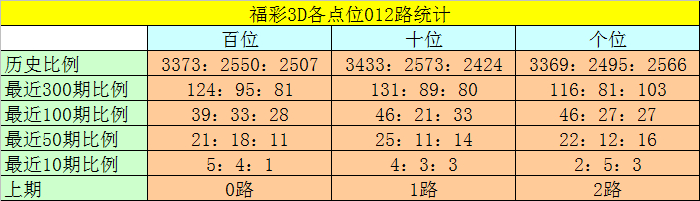 百位分析:该位最近10期开出了5个0路号码、4个1路号码、1个2路号码,0路号码热出,2路号码走冷。本期排除1路号码,参考号码:3。