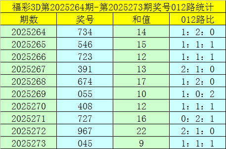 上期回顾:福彩3D第2025273期开出奖号:045。奖号为组六形态,与试机号有同号,奇偶比为1:2,大小比为1:2,012路比为1:1:1,和值为9,跨度为5。